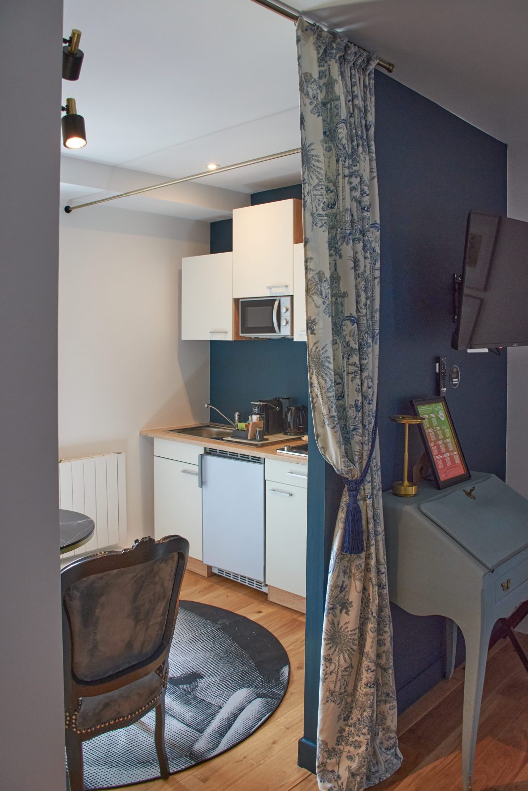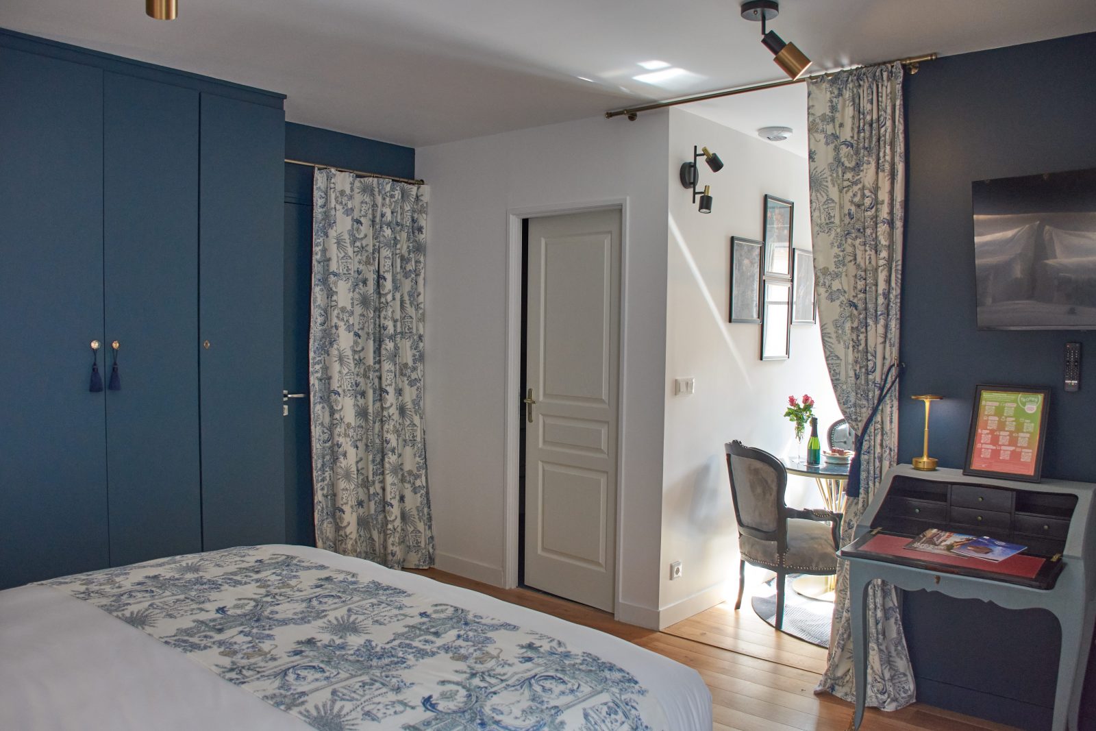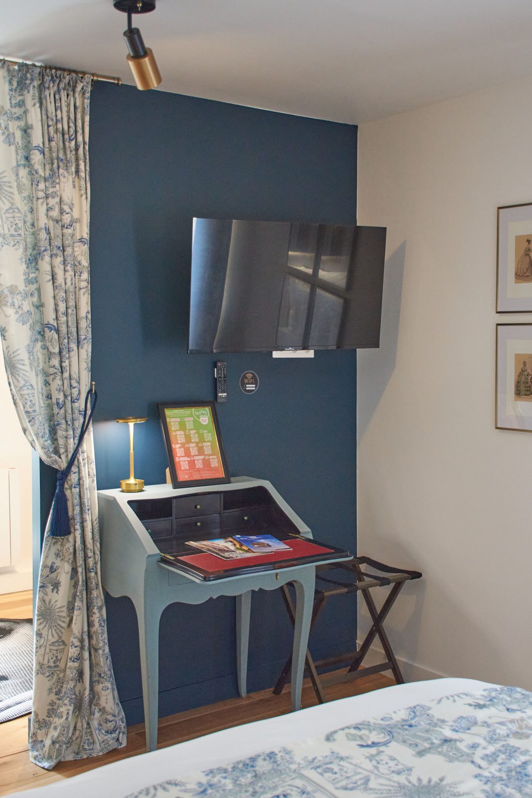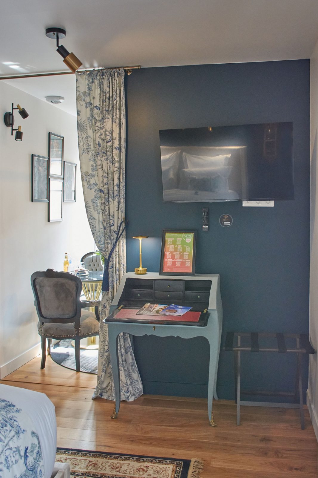 With its authentic 18th-century decor and toile de Jouy curtains, it offers absolute peace and quiet overlooking a pretty garden, right in the heart of the historic center. Designed and maintained with the environment in mind, you'll find organic teas, coffees, fruit juices and sweet and savory snacks, plus mineral water in the fridge. The bathroom is fitted with organic honeycomb towels, and organic courtesy products include shower gel, shampoo and conditioner, body lotion, beauty kit, sewing kit, shower caps, hand wash and soap, comb, toothbrush and toothpaste.