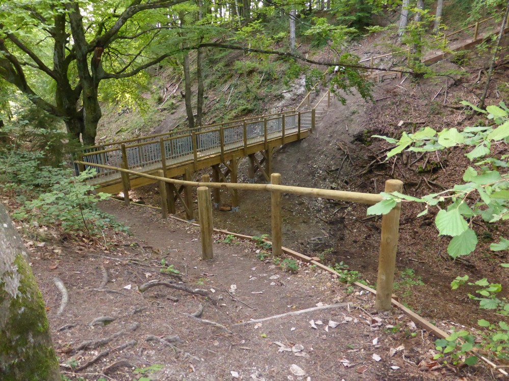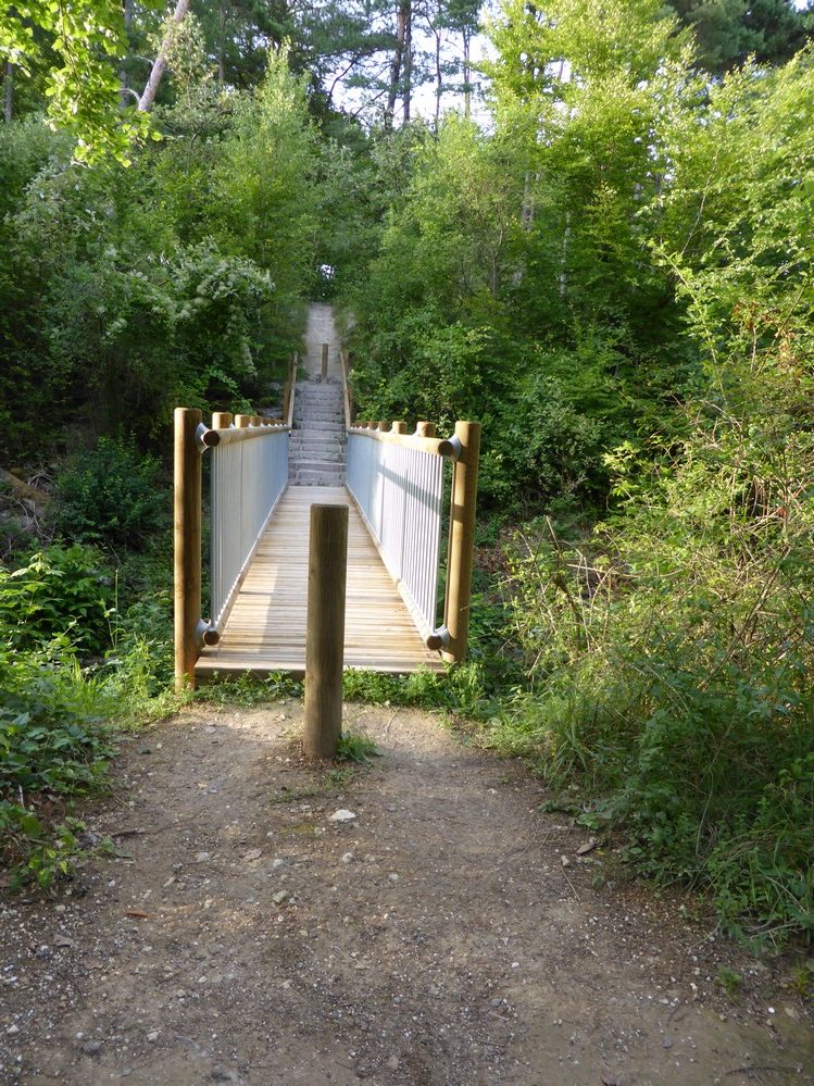 Now a wood (signs indicate the more remarkable species), the knoll opens on to a clearing where a source gives life to two pools and a fountain. Further on, several paths wind their way up, in some cases abruptly, crossing a double crown of ditches with footbridges to the oppidum perched at the top.